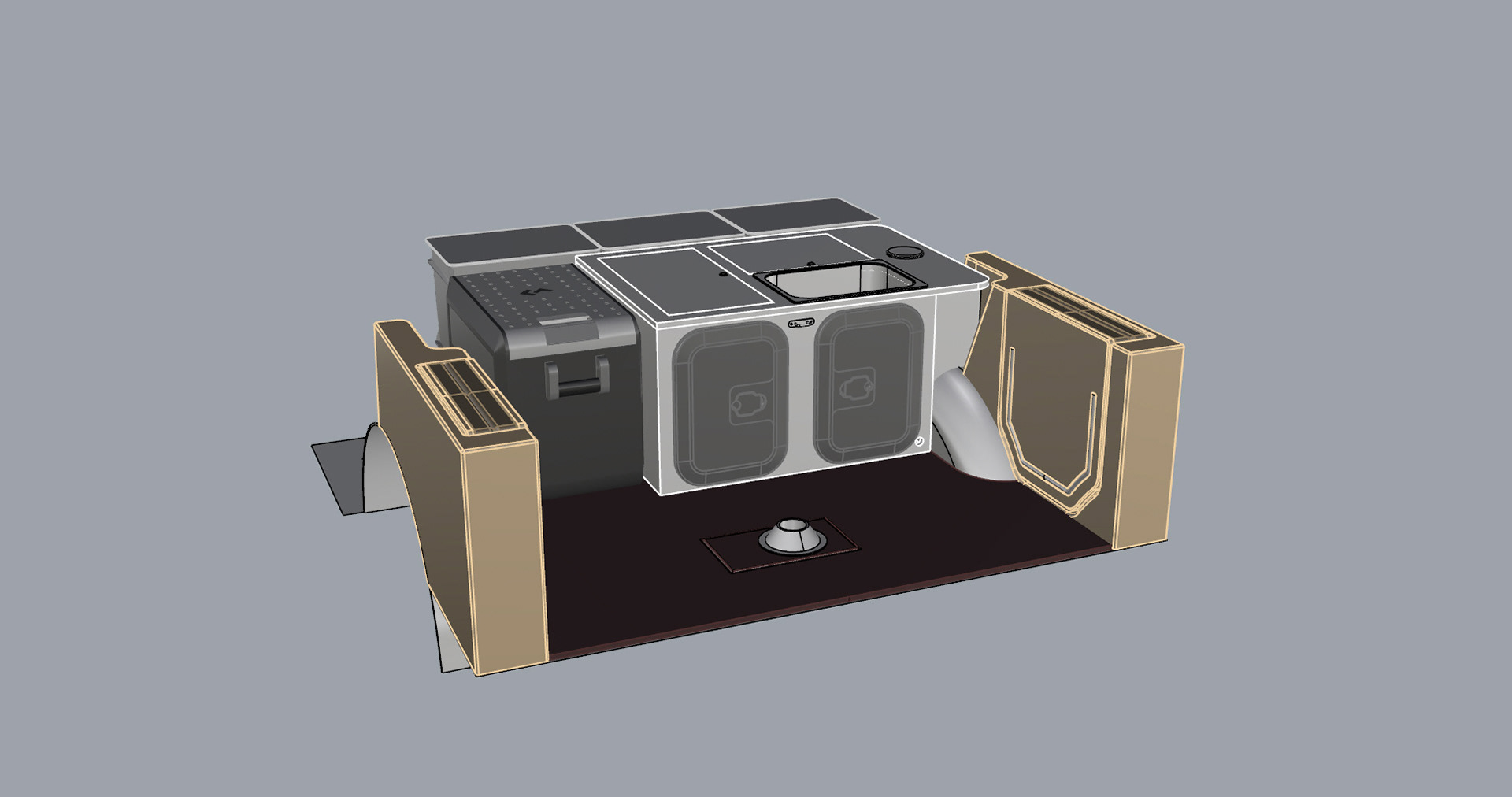 Il kit include un serbatoio dell'acqua per il vano piedi da 45 litri, una pompa dell'acqua esterna autoadescante, una doccia/rubinetto con tubo flessibile da 4 metri, un lavandino in acciaio inox e 3 contenitori di stoccaggio 40x30x32