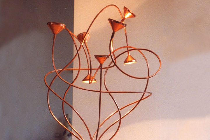 Lampada realizzata con tubi ed imbuti di rame.